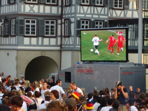 Der LED Truck 1 in Backnang bei Stuttgart auf dem historischem Stiftsplatz in der Altstadt zur Fußballeuropameisterschaft 2008. 4000 Menschen erlebten die spannenden EM Spiele auf der 9m² LED Wand in der besten Qualität für tageslichttaugliche LED Videodisplaytechnologie in 16:9.